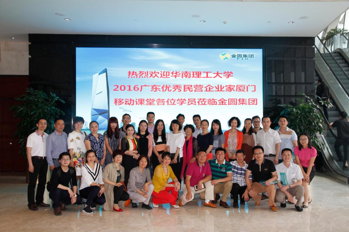 5月13日下午,华南理工大学2016广东优秀民营企业家厦门移动课堂学员一行34人到访金圆集团参观交流。粤企学员们首先来到两岸金融中心展厅,观看两岸金融数字沙盘和规划展板,随后双方在43楼会议室举行座谈交流,集团战略发展部、金融学院、信托公司、创投公司、金圆资本等部门及子公司负责人参加座谈。