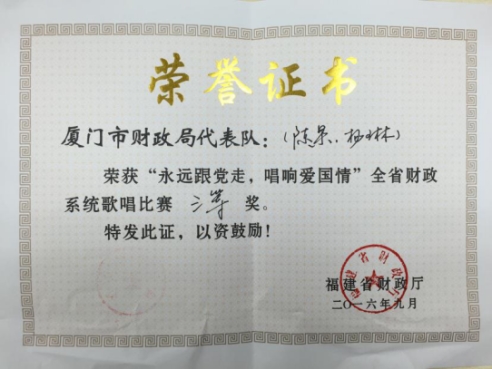 9月29日,省财政厅机关党委举办的以“永远跟党走 唱响爱国情”为主题的全省财政系统唱歌比赛圆满落下帷幕。金圆集团陈果、杨琳代表厦门市财政局前往省财政厅参加比赛,荣获三等奖。