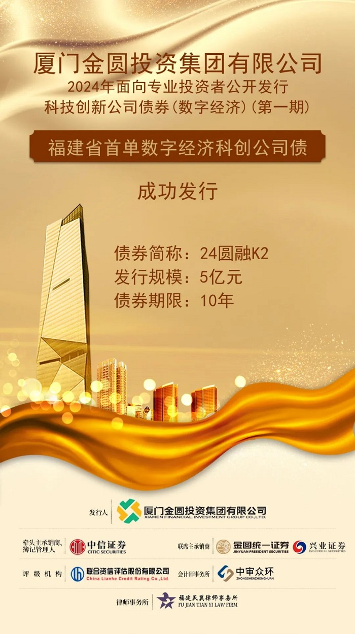 4月23日,金圆集团在深圳证券交易所成功发行10年期数字经济科技创新公司债,发行规模5亿元。本期债券由中信证券牵头主承,金圆统一证券和兴业证券联席承销。此次发行为金圆集团成立以来首次发行10年期债券,在低息周期锁定了长期限的较低融资成本。