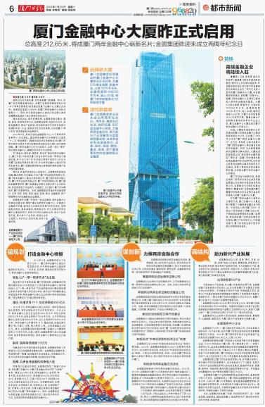 抢抓对台合作新机遇,书写美丽厦门新篇章。昨日,在厦门岛东部最美海岸线上,由厦门金圆投资集团有限公司(以下简称金圆集团)投资建设的厦门金融中心大厦正式启用。该建筑总高度212.65米,是厦门两岸金融中心地标式建筑之一。同时,作为两岸金融中心建设开发运营主体的金圆集团也迎来了成立两周年的纪念日。