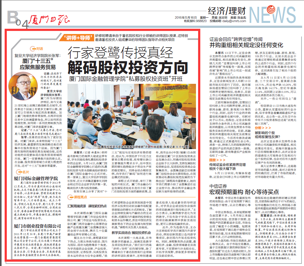 厦门日报讯 (记者 林露虹)老师是有影响力的商界大佬或业界专家,学生则是投身私募股权投资多年的企业家。5月14日,由厦门国际金融管理学院精心打造的《私募股权投资与资本战略高级研修班》在厦门国际金融中心正式开班。第一堂课上,复旦大学经济学院院长张军、泛太平洋集团董事长刘持金和近百位企业家学员齐聚一堂,畅谈经济大势与投资战略。