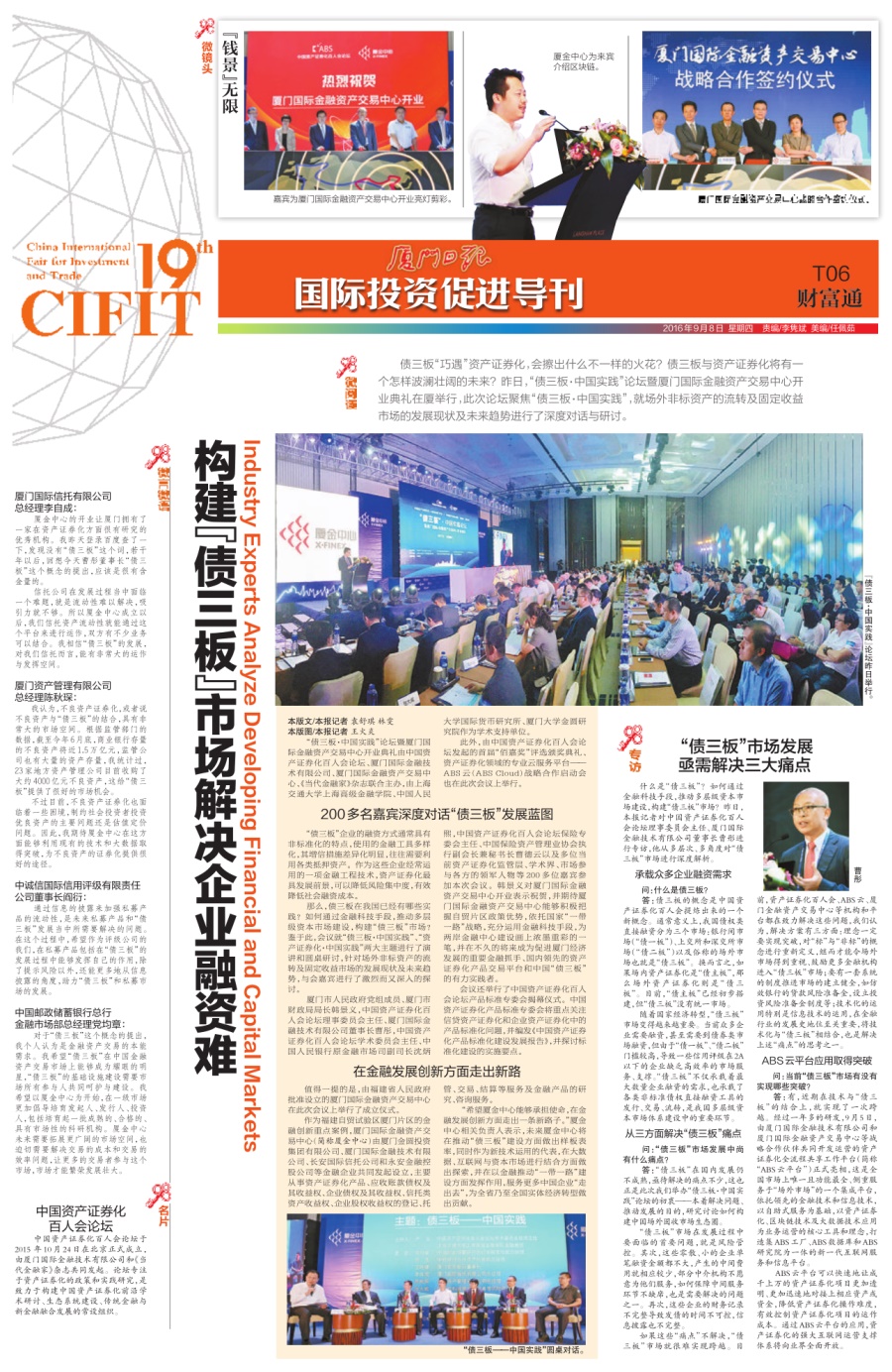 对于“债三板”这个概念的提出,我个人认为是金融资产交易的本能需求。我希望“债三板”在中国金融资产交易市场上能够成为耀眼的明星,“债三板”的基础设施建设需要市场所有参与人共同呵护与建设。我希望以厦金中心为开始,在一级市场更加倡导培育发起人、发行人、投资人,包括培育起一批成熟的、合格的、具有市场性的科研机构。厦金中心未来需要拓展更广阔的市场空间,也迫切需要解决交易的成本和交易的效率问题,让更多的交易者参与这个市场,市场才能繁荣发展壮大。