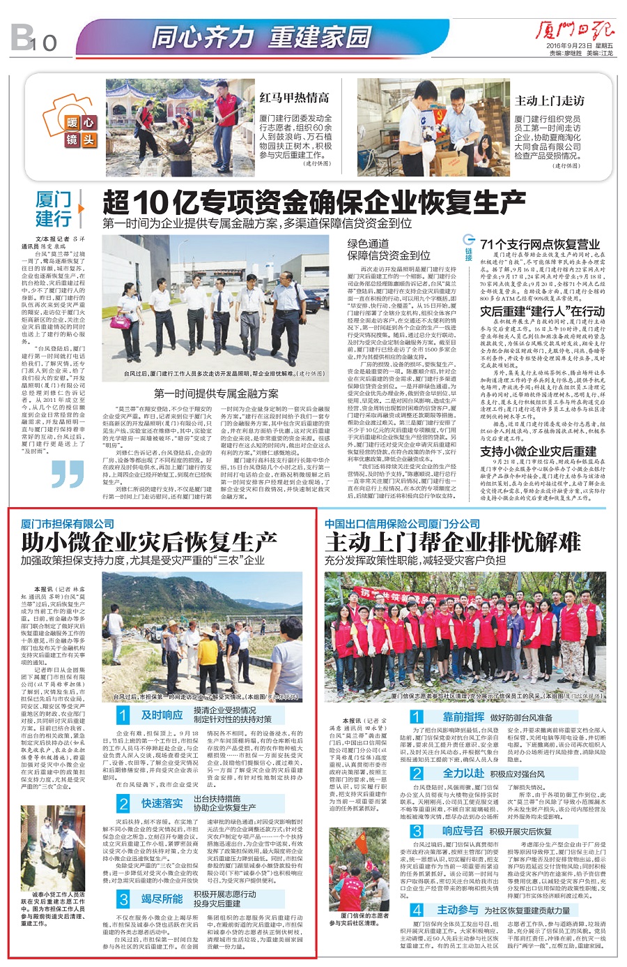 记者昨日从金圆集团下属厦门市担保有限公司(以下简称市担保)了解到,灾情发生后,市担保已先后与市农业局,同安区、翔安区等受灾严重地区的财政、农业部门对接,共同研讨灾后重建方案。目前已结合我省、市出台的相关政策,紧急制定灾后扶持办法(如采取免收农户、农业企业担保费等积极措施),着重加强对受灾中小微企业在灾后重建中的政策担保支持力度,尤其是受灾严重的“三农”企业。