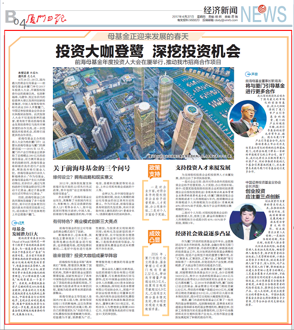 前海母基金主办的投资人大会为啥在厦门开?这要从前海母基金与厦门的渊源说起——2015年12月,厦门市产业引导基金出资参股了总规模达280亿元的前海母基金,双方展开基金业务的战略协同,前海母基金将积极在我市进行产业投资,帮助我市吸引基金入驻。前海母基金执行合伙人靳海涛表示:“作为母基金,前海母基金将产生巨大的联动效应,初步估计,通过与其他政府引导基金联动可以带动千亿资金,通过子基金联动方式可带动万亿资金。”