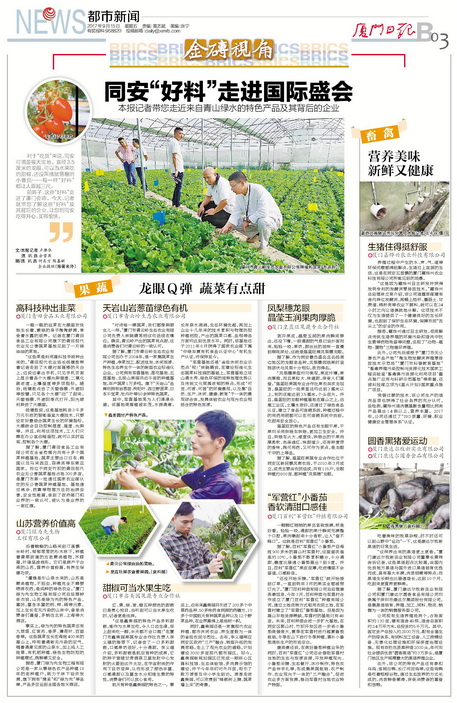 以《同安“好料”走进国际盛会——本报记者带您走近来自青山绿水的特色产品及其背后的企业》为题对走进“厦门会晤”的9家同安“好料”企业进行整版报道,其中厦门市青云岭生态农业有限公司等8家企业为厦门市担保有限公司农业担保分公司(下称“厦农担”)的客户或其关联企业。