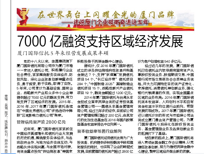 党的十八大以来,金圆集团旗下厦门国际信托有限公司作为厦门市唯一一家法人信托公司,积极履行企业社会责任,紧紧围绕服务实体经济、防控风险、深化企业改革创新等重点任务,勇于探索,敢于实践,取得了实效。5年来,公司累计为基础设施、国有企业、战略新兴产业和众多中小企业等提供超过7000亿元的融资支持,有力地支持了区域经济的发展。2015年、2016年、2017年厦门国际信托连续在“中国优秀信托公司”评选活动中蝉联“区域影响力信托公司”殊荣。
