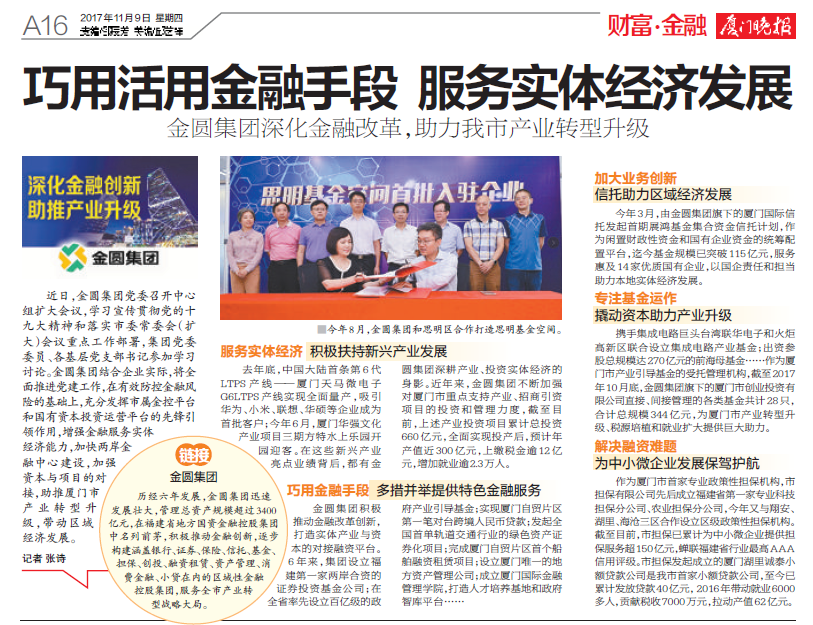 金圆集团积极推动金融改革创新,打造实体产业与资本的对接融资平台。6年来,集团设立福建第一家两岸合资的证券投资基金公司;在全省率先设立百亿级的政府产业引导基金;实现厦门自贸片区第一笔对台跨境人民币贷款;发起全国首单轨道交通行业的绿色资产证券化项目;完成厦门自贸片区首个船舶融资租赁项目;设立厦门唯一的地方资产管理公司;成立厦门国际金融管理学院,打造人才培养基地和政府智库平台……