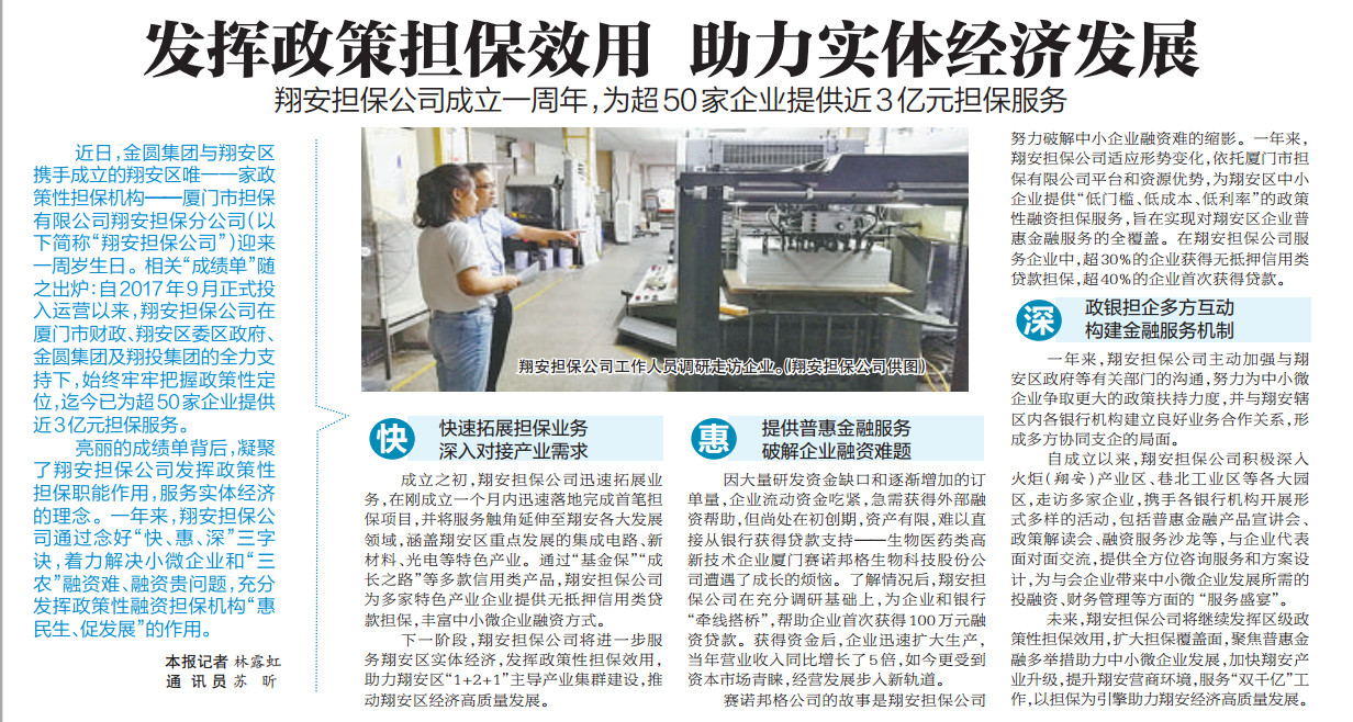 近日,金圆集团与翔安区携手成立的翔安区唯一一家政策性担保机构——厦门市担保有限公司翔安担保分公司(以下简称“翔安担保公司”)迎来一周岁生日。相关“成绩单”随之出炉:自2017年9月正式投入运营以来,翔安担保公司在厦门市财政、翔安区委、区政府、金圆集团及翔投集团的全力支持下,始终牢牢把握政策性定位,迄今已为超50家企业提供了近3亿元的担保服务。