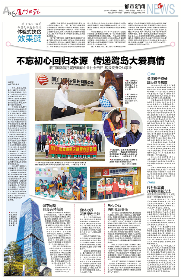 厦门国际信托始终秉持“稳健经营、诚实信用、开拓创新、有效回报”的经营宗旨,为投资人获取长期、持续的投资回报,积极践行企业的社会责任。由该公司受托管理、厦门市私立集美学校委员会出资设立的公益信托,产生的2507万元投资收益已全部捐赠给厦门市陈嘉庚教育基金会。