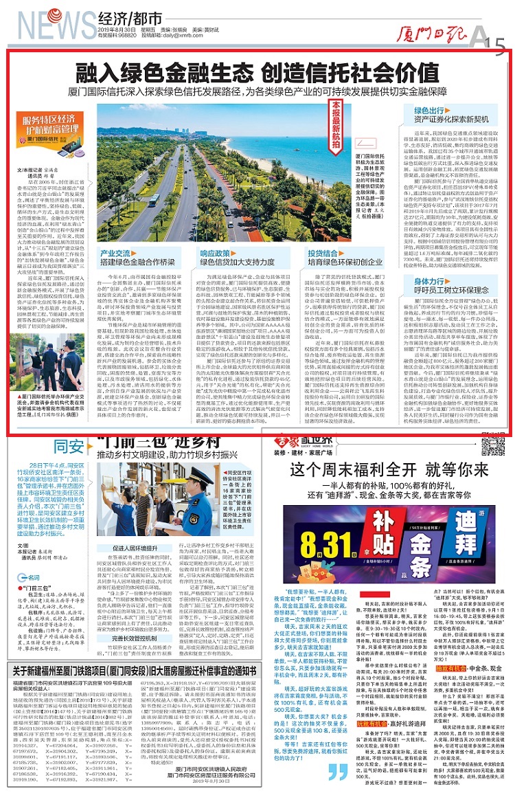 近年来,厦门国际信托深入探索绿色信托发展路径,通过创新金融服务模式,开展了绿色贷款信托、绿色股权投资信托、绿色资产证券化信托等多种业务,为环境保护、生态旅游、生态科技、园林景观工程、节能减排、再生资源等各类绿色产业的可持续发展提供了切实的金融保障。