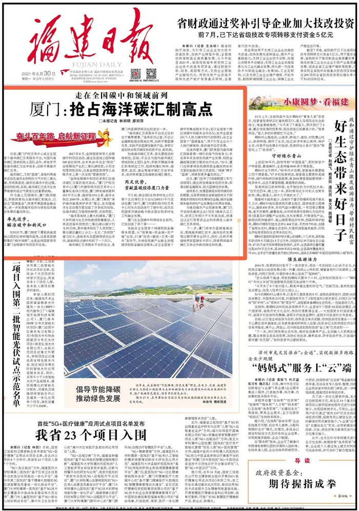 今天,《福建日报》在头版刊发报道《走在全国碳中和领域前列厦门:抢占海洋碳汇制高点》