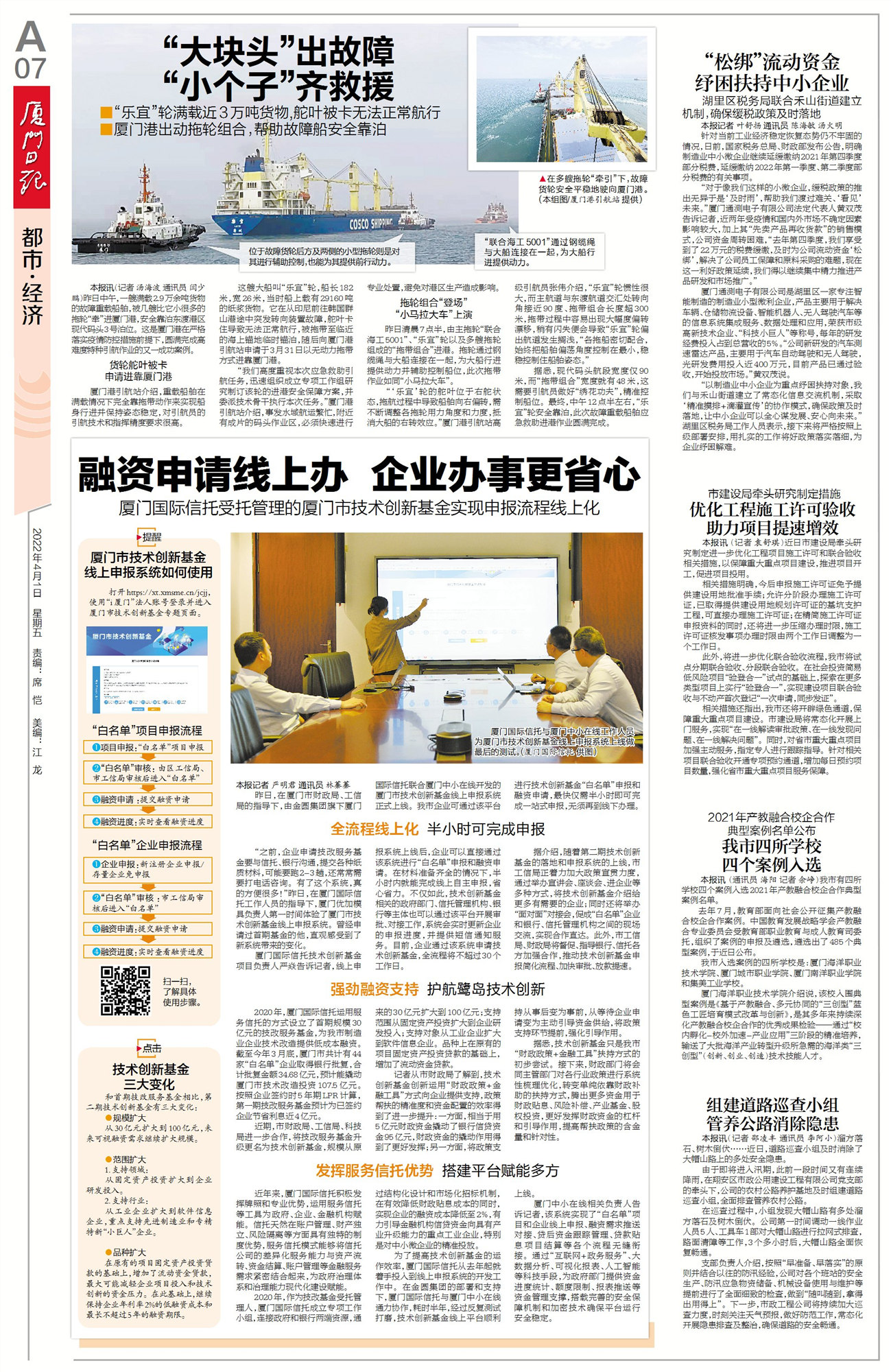 昨日,在厦门市财政局、工信局的指导下,由金圆集团旗下厦门国际信托联合厦门中小在线开发的厦门市技术创新基金线上申报系统正式上线。我市企业可通过该平台进行技术创新基金“白名单”申报和融资申请,最快仅需半小时即可完成一站式申报,无须再到线下办理。