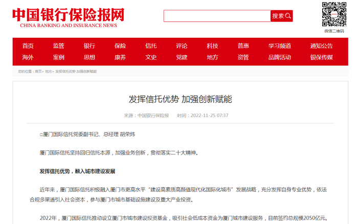 2022年,厦门国际信托推动设立厦门市城市建设投资基金,吸引社会低成本资金为厦门城市建设服务,目前签约总规模2050亿元。