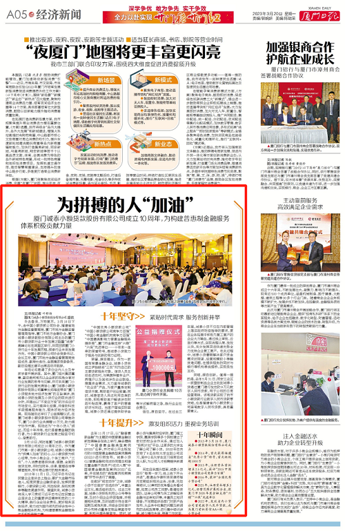 3月18日,同时是厦门诚泰小额贷款股份有限公司成立10周年之日。作为厦门市第一家小额贷款公司,诚泰小贷秉持为“拼搏人加油”的初心,以小额贷款为核心纽带,为中小微企业、个体工商户、“三农”、个人消费者提供快速、便捷、全面的信贷支持,并附加财务、法律、管理咨询等增值服务,弥补商业银行的服务盲点。