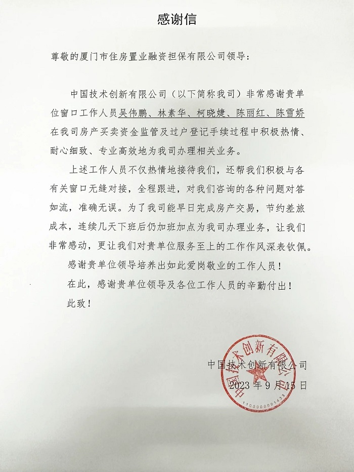 近日,厦房担保收到中国技术创新有限公司(简称创新公司)的感谢信,在办理资金监管业务的过程中,创新公司对厦房担保驻政务服务中心窗口工作人员的优质服务表示了深深感谢。