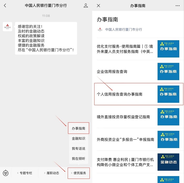 “中国人民银行厦门市分行”公众号查询征信代理点