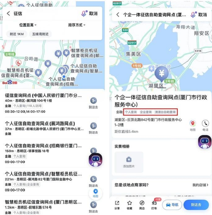 1.征信代理点查询,本人持有效身份证原件到个人征信查询代理点办理,目前全厦门共设置近500个征信自助查询代理点哦,包含55台自助查询机和450多台商业银行智慧柜员机,供市民就近查询。查询点的位置大家可通过“中国人民银行厦门市分行”公众号-“便民服务”-“办事指南”中或百度、高德地图查询。