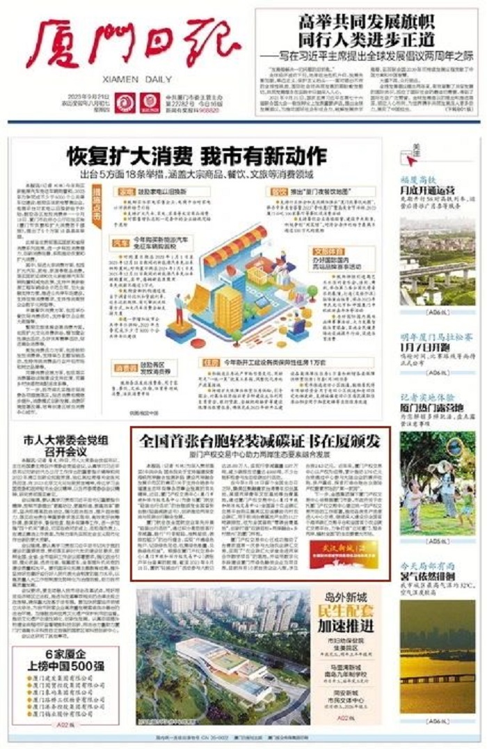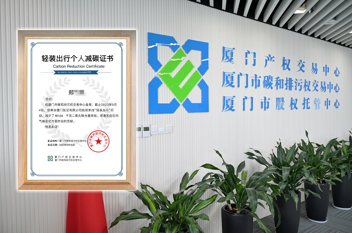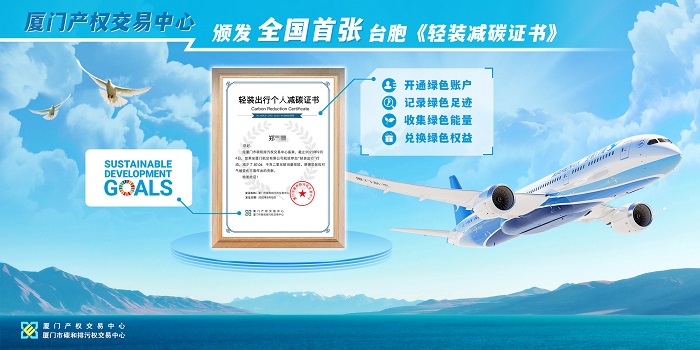 为深入贯彻落实《中共中央 国务院关于支持福建探索海峡两岸融合发展新路 建设两岸融合发展示范区的意见》关于支持台胞参与福建生态环保等各项事业发展的有关精神,近日,金圆集团旗下厦门产权交易中心(厦门市碳和排污权交易中心)为参与厦门航空“轻装出行活动”的台胞颁发全国首张台胞《轻装减碳证书》,创新推动两岸交流与低碳出行融合发展。