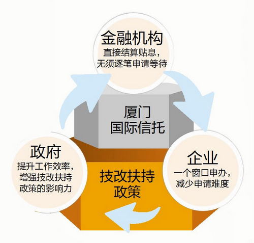 我们在市工信局、财政局与厦门银保监局的指导下,设立了全国首单技改基金服务信托。将传统的事后拨款补贴改为事中贷款或股权投资,通过结构化设计,实现财政资金对社会资金5:95的大杠杆比例撬动,极大地提高了财政资金的配置效率,更大程度地让众多中小微企业受惠。另一方面,我们通过引入市场化运作机制,辅以财政贴息,将企业融资成本降低至2%,引导金融机构信贷资金向具有产业升级能力的重点工业企业,特别是中小微企业精准投放,从而顺利实现金融助力实体经济、中小微企业发展。