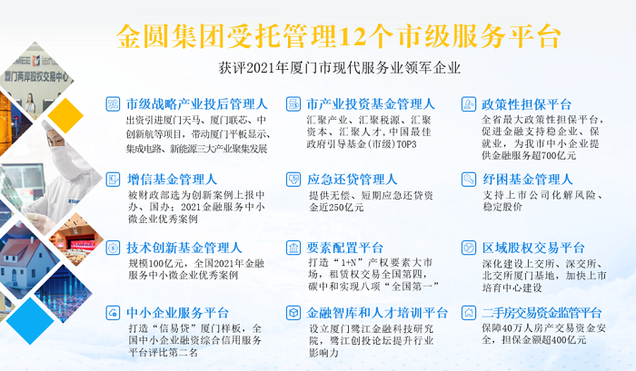 金圆集团作为厦门市现代服务业领军企业,拥有14张各类金融牌照,受托管理12个市级服务平台,致力打造全国一流的综合性金融服务商,构建多手段、一揽子的全链条资本服务生态圈。