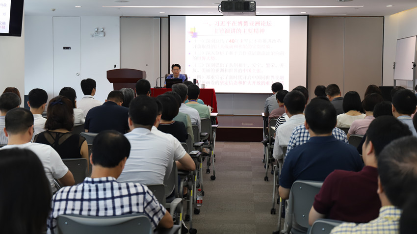为深入学习贯彻习近平总书记在博鳌亚洲论坛2018年年会开幕式和庆祝海南建省办经济特区30周年大会上重要讲话精神,进一步提振精气神、推动集团全体干部在新时代厦门经济特区建设中建功立业,5月25日上午,金圆集团特别邀请厦门市委党校学术委员会委员、统战部主任周明伟进企业做《习近平总书记在博鳌亚洲论坛重要讲话精神及海南省战略意义》专题讲座,集团中层及以上领导干部、各党支部书记和委员、集团青年智库成员等近百人参加讲座。