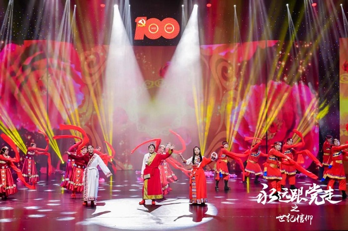 演出以大型情景史诗的形式呈现,采用“4 2”结构,分为“日出东方”“气壮山河”“雄狮觉醒”“世纪信仰”四个篇章以及首尾的“启航 信仰的起点”“再出发 永远跟党走”部分。